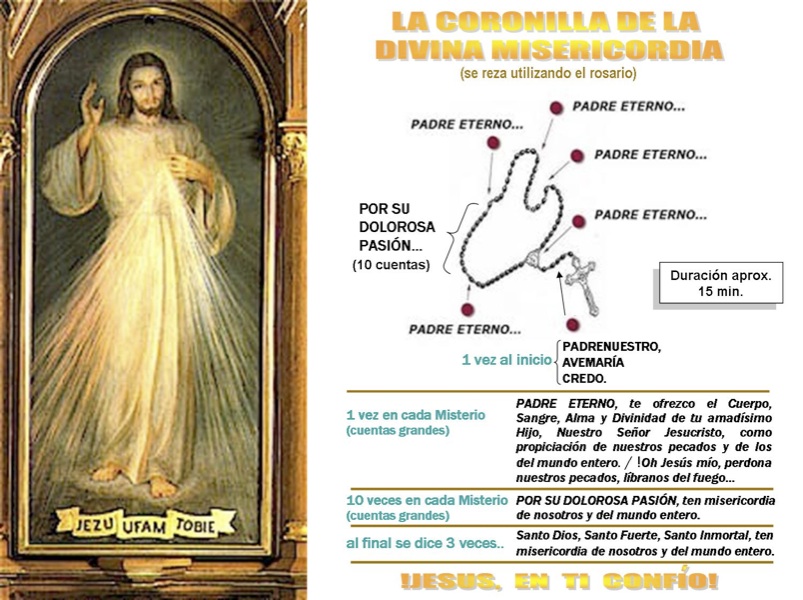«Reza continuamente la Coronilla que te he enseñado. Yo circundaré de gran Misericordia a los que la reciten ya sea durante la vida, ya, más particularmente, en la hora de la muerte. Que los sacerdotes la recomienden a los pecadores como última tabla de salvación… Deseo que todo el mundo conozca mi Misericordia. Otorgaré inmensas gracias a las almas que confíen en Ella…».